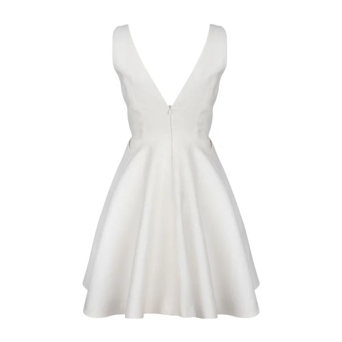 Deep-v neck & back, short flare dress supported with 100% cotton interlining for sharp bouffant silhouette