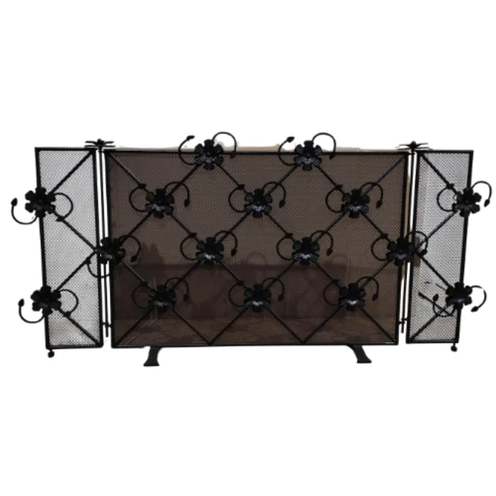 The iron fireplace screen with a floral pattern provides a protective yet aesthetic barrier in front of the fireplace