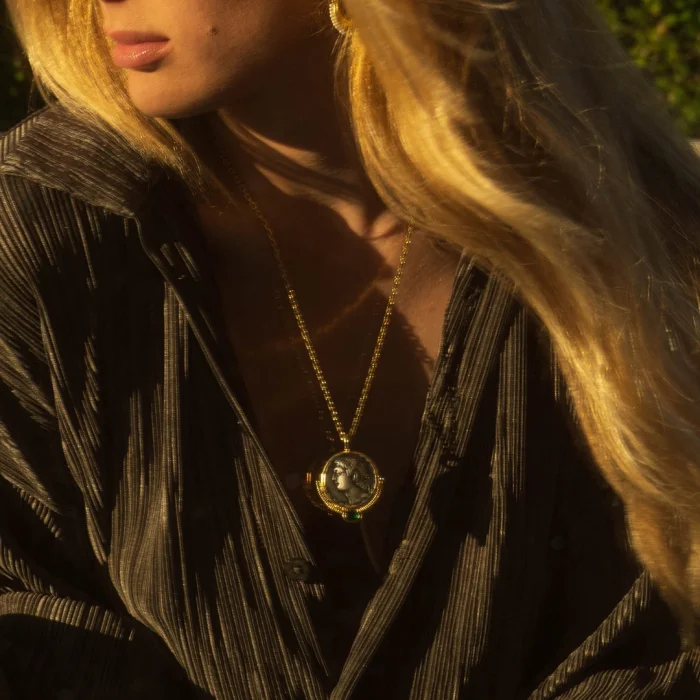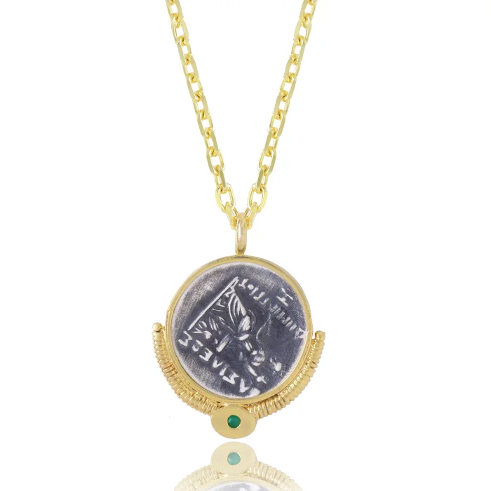 The Alexander Coin pendant is a real lion ancient Roman coin in mint status. The coin is surrounded by two leaves and a hand-carved 22K Gold Vermeil cast with an Emerald stone symbolizing its seductive gold crown in the middle. The head of the deified Alexander the Great, who wore the horn of Ammon over his ear. Reverse: The Kingdom of Pontus under the trident; Athena Nikephoros, seated on the left; mint sign on the throne. The "Great", Eupator, Mithridates VI, reigned from 120 to 63 BC. Gold Stater (8.31 g). Between 88 and 86 BC, a Lysimachus-type coin was minted at Kallatis. (Pendant Size: L: 4.4 cm - W: 3.4 cm) *This is an imitation of an original antique coin. 22K Gold was poured into Vermeil by the Vermeil chain.