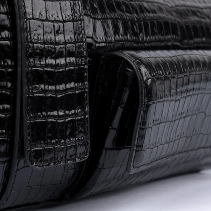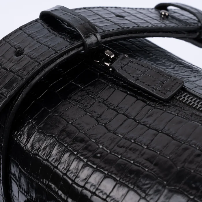 Square prism bag in crocodile black calf leather with zipper closure and adjustable shoulder strap. One side pocket with magnetic closure and internal pocket with zip. Black stitching and internal black velvet lining.