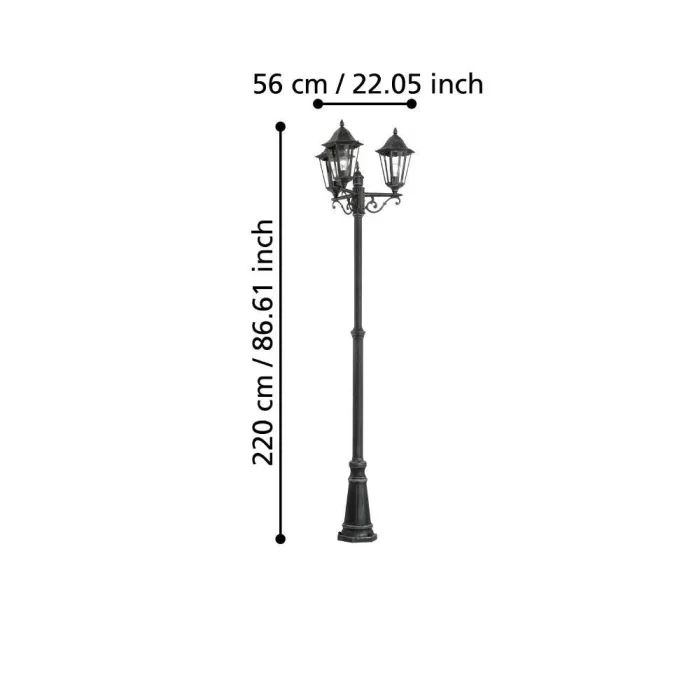 Bulb Holder Type:E27 Maximum Wattage: 3X60W Product Height: 220 cm Product Diameter: 56 cm Net Weight: 9.53 Kg Main Material: Aluminum Die Casting Main Color: Black, Silver-Patinine Glass/Hat Material: Glass Glass/Hat Color: Transparent IP Status: IP44 Switch Type: Wall Switch Product Voltage: 220-240V,50/60Hz