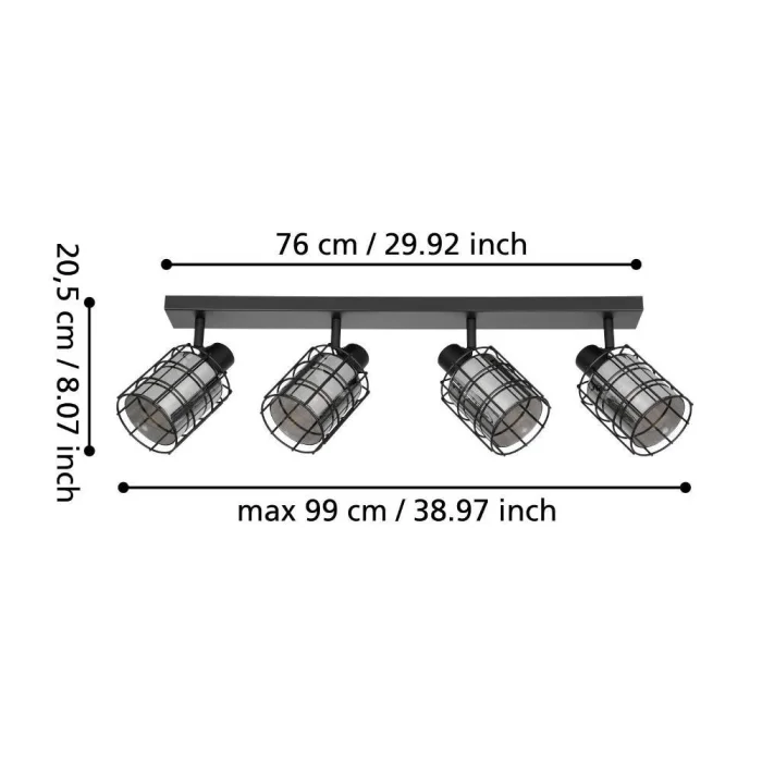Bulb Holder Type: E27 Maximum Wattage: 4X40W Product Height: 20.5 cm Product Length: 78 cm Provision Protrusion: 23.5 cm Net Weight: 3.69 Kg Main Material: Steel Main Color: Black Glass/Hat Material: Vaporized Glass Glass/Hat Color: Black-Transparent IP Status: IP20 Switch Type: Wall Switch Product Voltage: 220-240V,50/60Hz