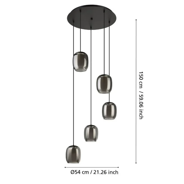 Bulb Holder Type: E27 Maximum Wattage: 5X28W Product Height: 150 cm Product Diameter: 54 cm Net Weight: 7.04 Kg Main Material: Steel Main Color: Black Glass/Hat Material: Vaporized Glass Glass/Hat Color: Grey IP Status: IP20 Switch Type: Wall Switch Product Voltage: 220-240V,50/60Hz