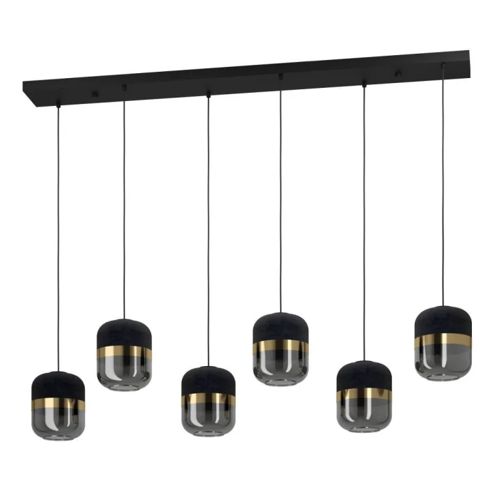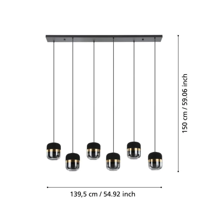 Bulb Holder Type: E27 Maximum Wattage: 6X40W Product Height: 150 cm Product Length: 139.5 cm Product Width 27 cm Net Weight: 9.41 Kg Main Material: Steel Main Color: Black Glass/Hat Material: Textile Fabric, Foil, Glass Glass/Hat Color: Black, Gold, Black-Transparent IP Status: IP20 Switch Type: Wall Switch Product Voltage: 220-240V,50/60Hz