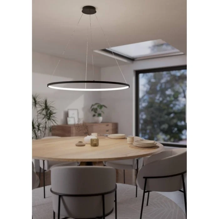 Bulb holder type: LED Maximum wattage: 40W bulb included. Product Height: 150 cm Product Diameter: 99 cm Net Weight: 3.7 Kg Main Material: Aluminum, Steel Main Color: Black Glass/Hat Material: Plastic Glass/Hat Color: White Kelvin: 2700-6500K Lumens: 4300 IP Status: IP20 Functions: Control by Remote Control, Remote Control Included Switch Type: Wall Switch Product Voltage: 220-240V,50/60Hz