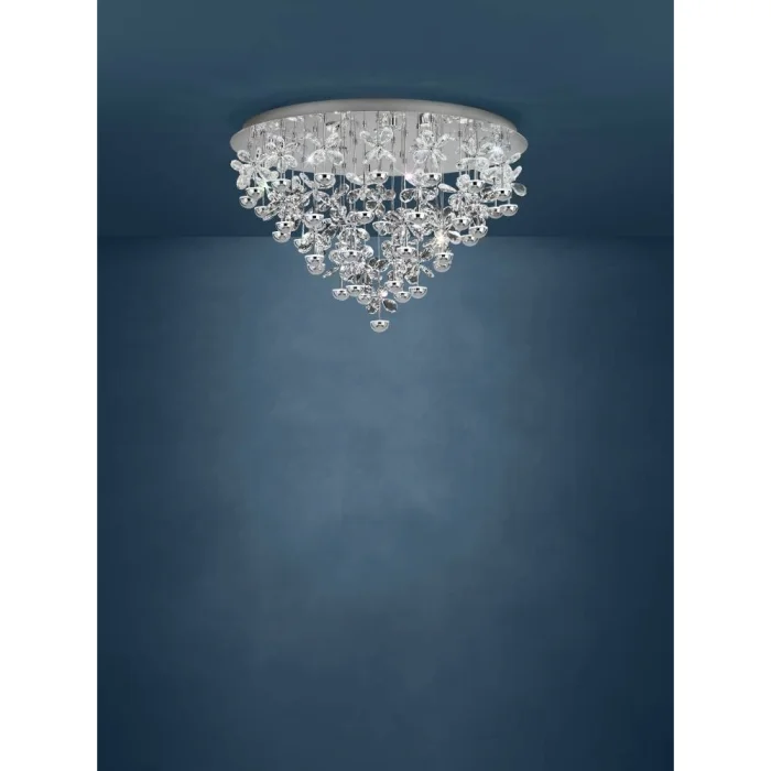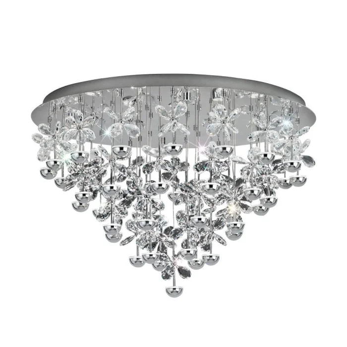 Bulb Holder Type: LED Maximum Wattage: 43X1.8W Bulb Included. Product Height: 52.5 cm Product Diameter: 78 cm Net Weight: 20.86 Kg Main Material: Stainless Steel Main Color: Chrome Glass/Hat Material: Glossy Glass Glass/Hat Color: Transparent Kelvin: 3000K Lumens: 10320 IP Status: IP20 Switch Type: Wall Switch Product Voltage: 220-240V,50/60Hz