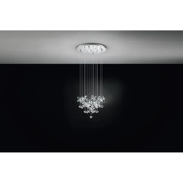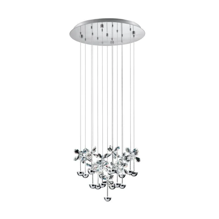Bulb Holder Type: LED Maximum Wattage: 15X2.5W bulb included. Product Height: 110 cm Product Diameter: 50 cm Net Weight: 7.51 Kg Main Material: Stainless Steel Main Color: Chrome Glass/Hat Material: Glossy Glass Glass/Hat Color: Transparent Kelvin: 3000K Lumens: 4050 IP Status: IP20 Switch Type: Wall Switch Product Voltage: 220-240V,50/60Hz