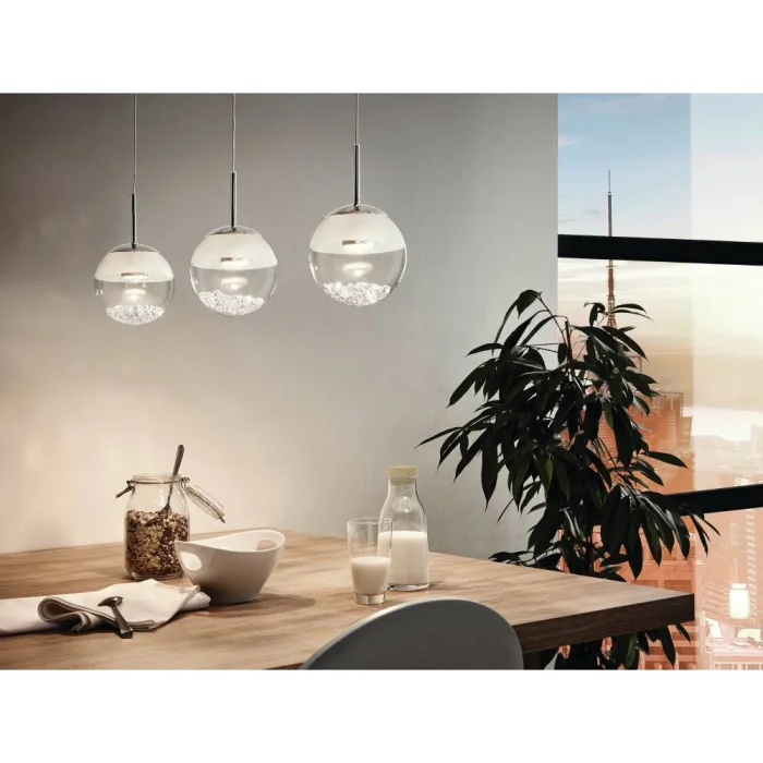 Bulb holder type: LED Maximum wattage: 3X5W bulb included. Item Height: 110 cm Product Length: 87 cm Product Width 14 cm Net Weight: 4.27 Kg Main Material: Steel Main Color: Chrome Glass/Hat Material: Glass, Glossy Glass Glass/Hat Color: White, Transparent Kelvin: 3000K Lumens: 1500 IP Status: IP20 Switch Type: Wall Switch Product Voltage: 220-240V,50/60Hz