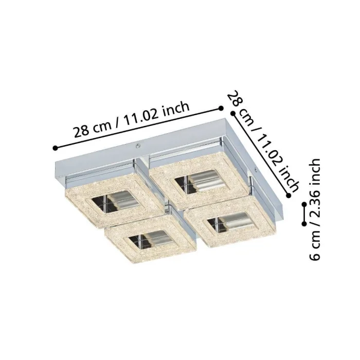 Bulb Holder Type: LED Maximum Wattage: 4X3.5W bulb included. Product Height: 6 cm Product Length: 28 cm Product Width 28 cm Net Weight: 2.03 Kg Main Material: Steel Main Color: Chrome Glass/Hat Material: Plastic, Polished Glass Glass/Hat Color: Chrome, Transparent Kelvin: 3000K Lumens: 1600 IP Status: IP20 Switch Type: Wall Switch Product Voltage: 220-240V,50/60Hz