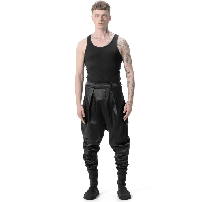 COMFORTABLE MODERN TROUSERS WITH MATTE SATIN FABRIC, SIDE POCKET DETAILS AND ELASTIC BAND AT THE BACK WAIST AND LEG Model