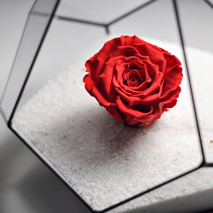 The geometric terrarium, the preserved red rose that can last up to 3 years in its original form, and white sand are delivered separately. After pouring the sand into the terrarium, place the preserved rose in the sand to create the final presentation.