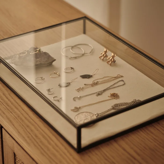 Product: Glass Jewelry And Accessory Box | Linen Base | Black | 35x25x5cm