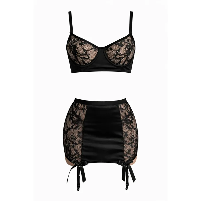 The Marvelle 3-Piece Satin Detailed French Lace Garter Bra Set offers a sophisticated silhouette where shiny satin surfaces combine with elegant French lace.