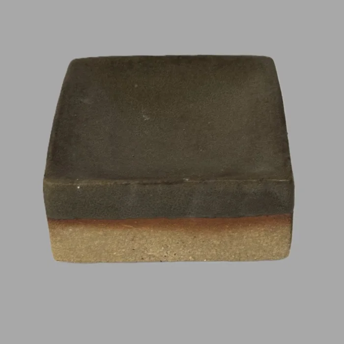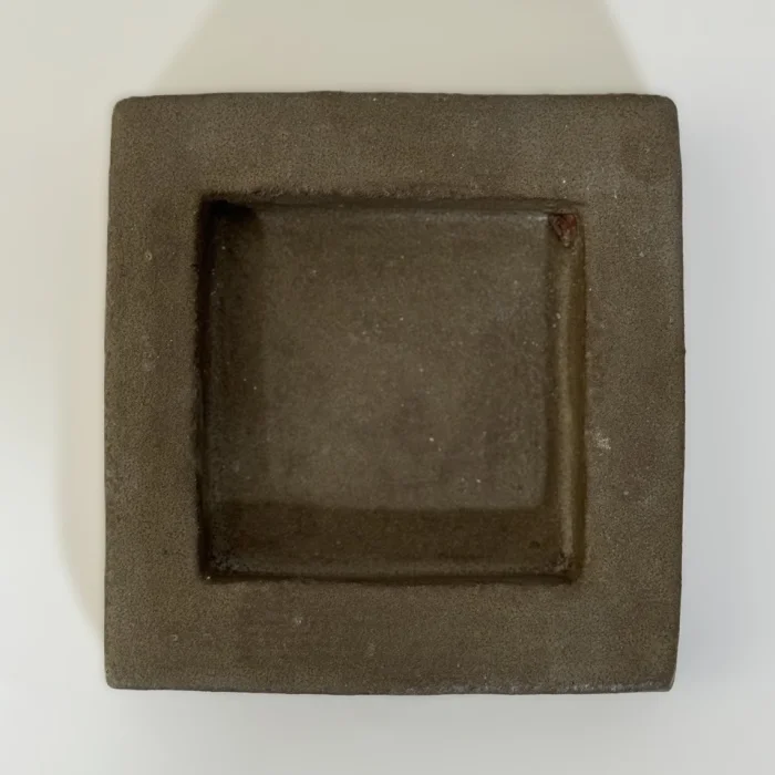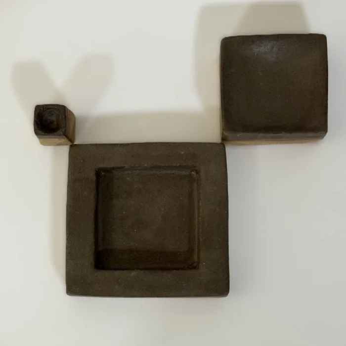 It consists of 2 square presentation plates and a small cup. Glaze is used in earth tones to reflect the tones of nature.