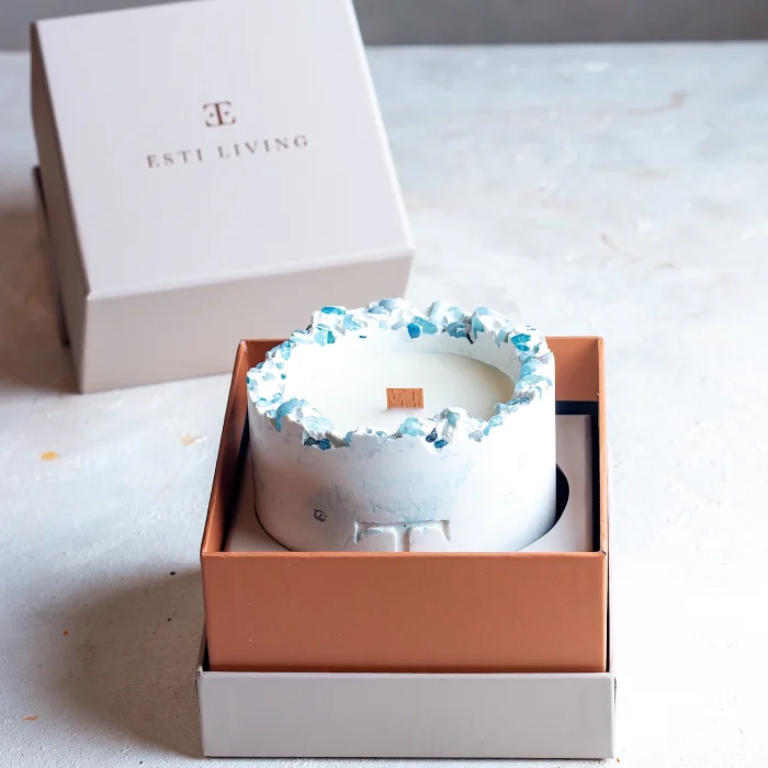 100% Vegan Coconut and Soy Blend Candle, 300gr Burning Time: About 50 hours Stone: Aquamarine