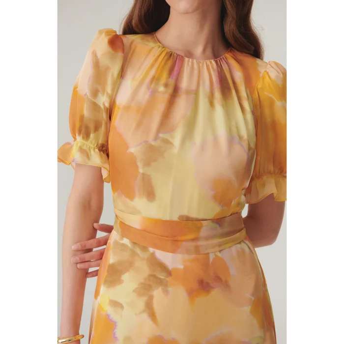 Creating an energetic effect with its abstract patterns, this midi length dress offers a feminine silhouette with its crewneck and balloon sleeve design. Its waist-fitting cut elegantly highlights your body, while its soft texture promises comfort all day long. This dress adapts to your every moment, making your style stand out.