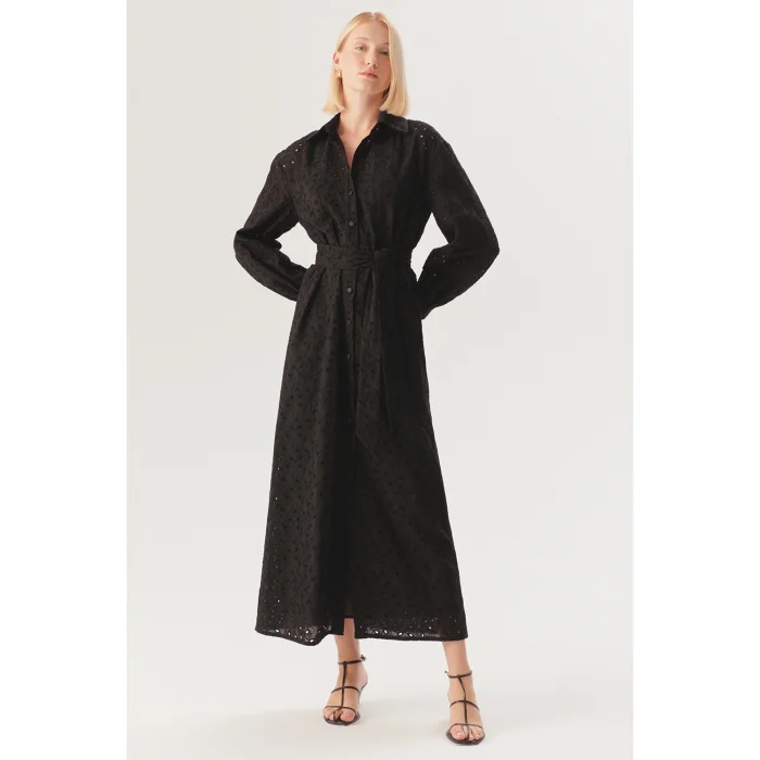 Combining timeless elegance and elegant craftsmanship, the black cotton fisto midi dress adapts to every moment of the day with its modern silhouette. While it offers a comfortable use thanks to its light texture, the delicately crafted fisto details add a touch of sophistication. The classic shirt collar and waist-tie belt design elegantly accentuates the body lines, while the regular cut provides freedom of movement. This dress, which can be adapted to both your daily style and special occasions with its midi length, has a minimal but impressive stance. Reflect the dynamism of the city to your style with this piece designed with the original touch of Exquise!