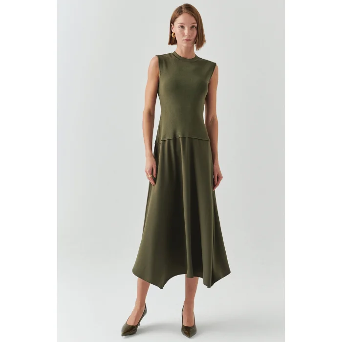 Product: Crew Neck Knitwear Garnished Asymmetric Cut Slim Fit Midi Dress