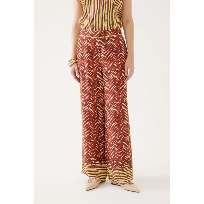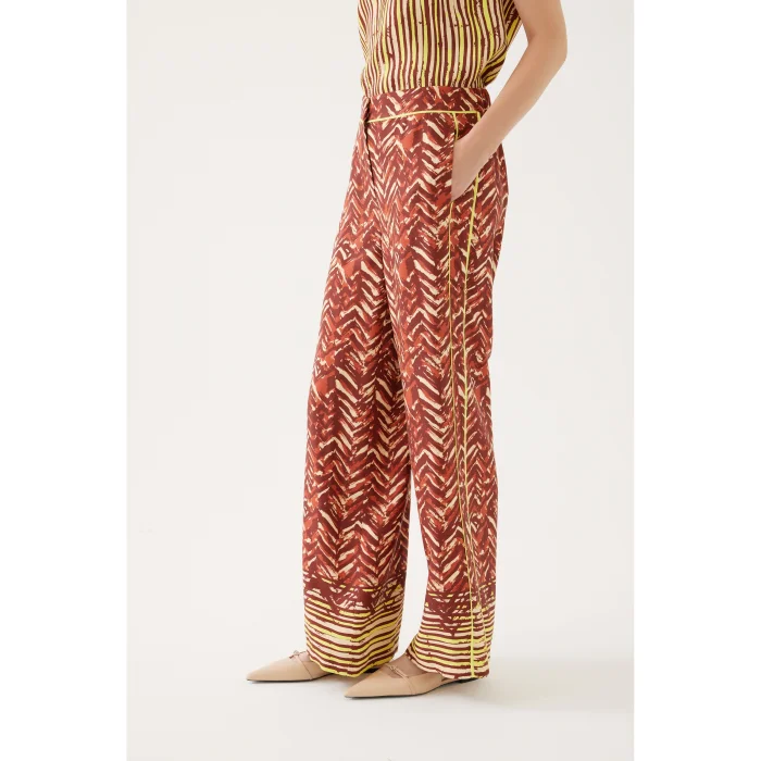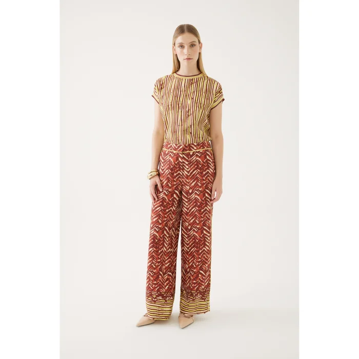 Designed by blending ethnic and geometric patterns on burgundy, intricately patterned trousers have an eye-catching style. Harmony of cream, yellow and tile colors; It adds vitality and dynamism to trousers. With its high waist, comfortable fit and wide legs, it provides both comfort and elegance.