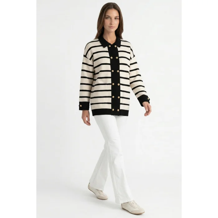 long-sleeved, buttoned oversize knitwear cardigan, which draws attention with its wide cut and black-cream striped design, will have a versatile place in your wardrobe. Offering both comfort and elegance together, this cardigan is a suitable option to complete the daily style of the modern woman. The knitwear texture keeps you warm in autumn and winter and provides comfortable use on cool days. The oversized cut of this knitwear cardigan offers freedom of movement and also gives it a modern look. The button details on the front give you the flexibility to use the cardigan open or closed, adding a functional feature to its design. The classic harmony of black and cream colors makes the cardigan easily combinable with different garments. This cardigan, which matches with jeans, tights or skirts, is also a suitable alternative for layered clothing. With its length above the knee on the model, it can easily match with clothes of different lengths. In addition to daily use, this product will accompany you on weekend outings, meetings with friends or in your search for comfortable elegance at home. It has a minimalist and stylish design, making it adaptable to both sporty and more classic combinations. It is designed to appeal to women who prioritize fashion and comfort. The soft texture of the knitwear material leaves a pleasant feeling on your skin and keeps you comfortable all day long. It is a suitable choice for those who both follow current trends and enjoy timeless pieces. With this cardigan, you will both have a stylish stance and feel comfortable all day long.