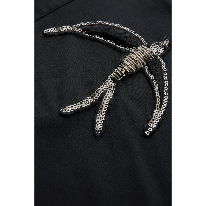 Bold, sophisticated and original! The tie collar detail combines classic elegance with modern touches, while the stone-embroidered brooch details add a striking atmosphere to the blouse. Offering comfort all day long thanks to its short sleeves and comfortable cut, this blouse is both light and breathable with its 100% pure cotton texture. A perfect choice to feel confident and stylish, day or night!