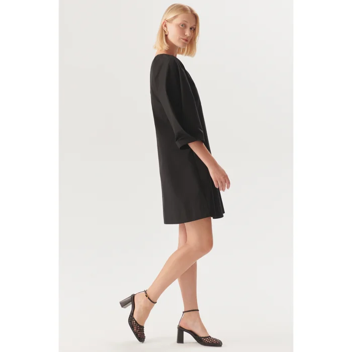 Offering a timeless and sophisticated style, the black mini dress with embroidery details makes a strong statement with its minimal design. The slightly widened regular cut provides comfort, while the embroidery detail on the chest adds an elegant touch to the dress. You can pair it with flat sandals to add a simple yet impressive atmosphere to your daily style, or complement it with evening chic heels and elegant accessories. Shaped by Exquise's original design approach, this dress creates a stylish and powerful style that adapts to every moment of city life.