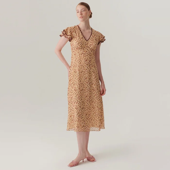 This midi-length dress, which gains movement with elegant patterns, creates a modern and feminine silhouette with its deep V-neck cut and sleeve details. Its chiffon-textured fabric offers a light and fluid stance, while its regular fit provides a balanced fit for every body. Thanks to its vibrant color transitions, it is a choice that effortlessly carries elegance from the office to evening meetings.