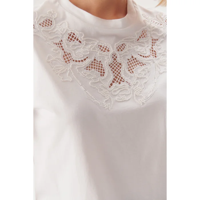 Standing out with its elegant and sophisticated design, this white knitted t-shirt combines classic and modern lines with lace embroidery details. It provides a feminine touch with its detailed embroidery on the chest area, delicately embroidered motifs and slightly transparent texture. Thanks to its soft and high quality fabric, it offers comfort all day long, while its stylish stance makes it an ideal option for both daily and special moments. The regular fit cut provides freedom of movement by fitting gently on the body, while the crewneck detail creates a timeless style. This stylish t-shirt, which will be an indispensable part of your wardrobe, is the perfect choice for those who want to create a minimal but impressive style.