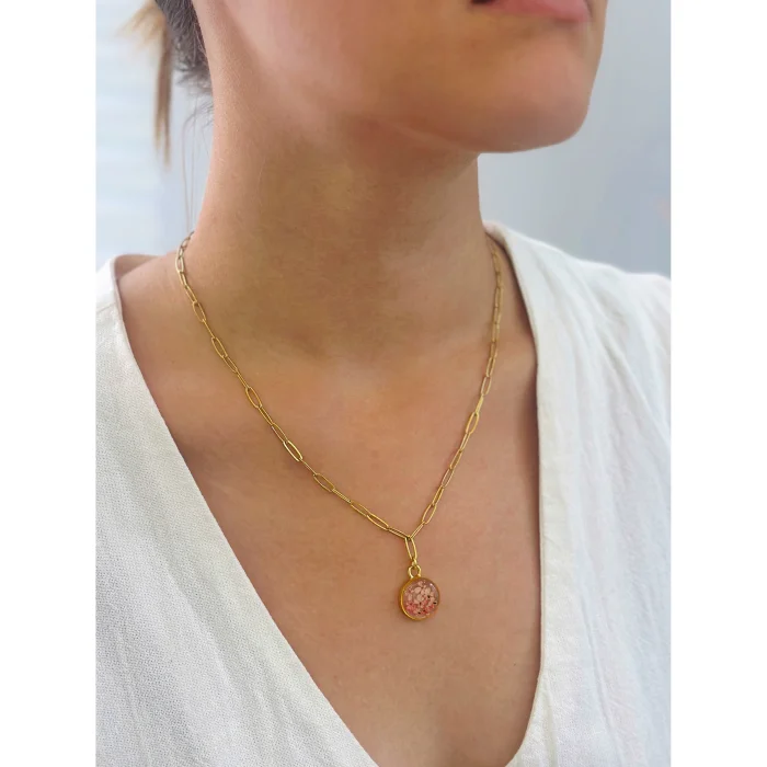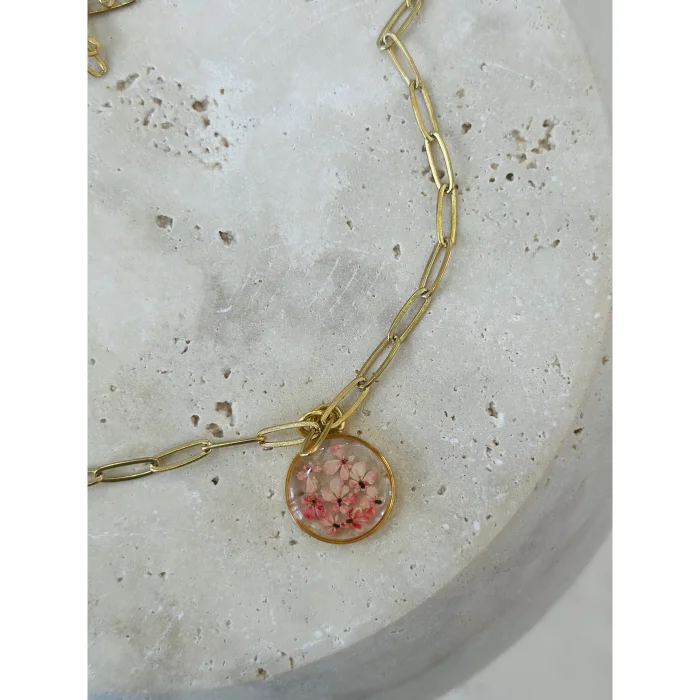 The way the tiny flowers are arranged is unique and no part will be the same as the other, the product will be exclusive only to its owner.The metal parts of the product and the chain are 14 karat gold plated.