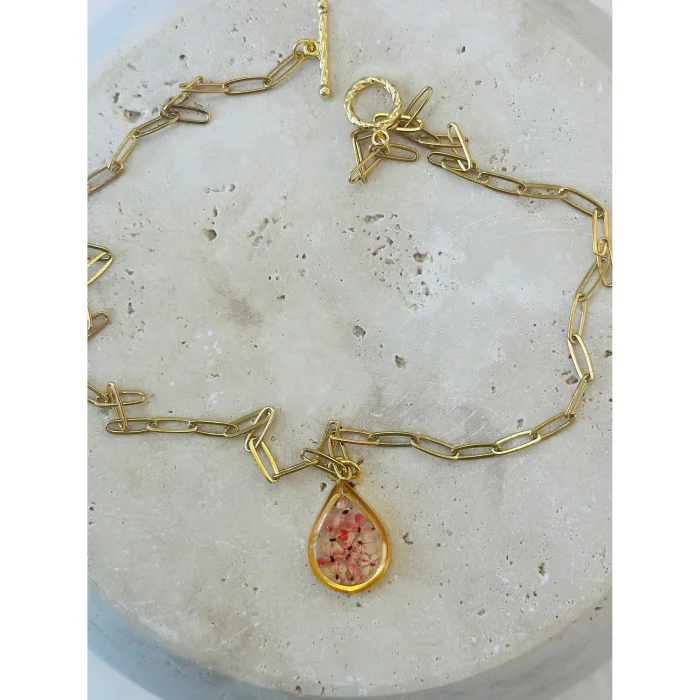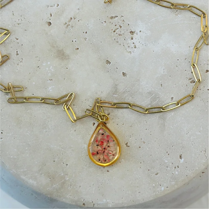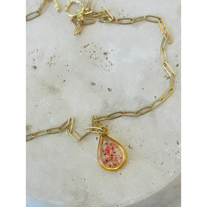 The way the tiny flowers are arranged is unique and no part will be the same as the other, the product will be exclusive only to its owner.The metal parts of the product and the chain are 14 karat gold plated.