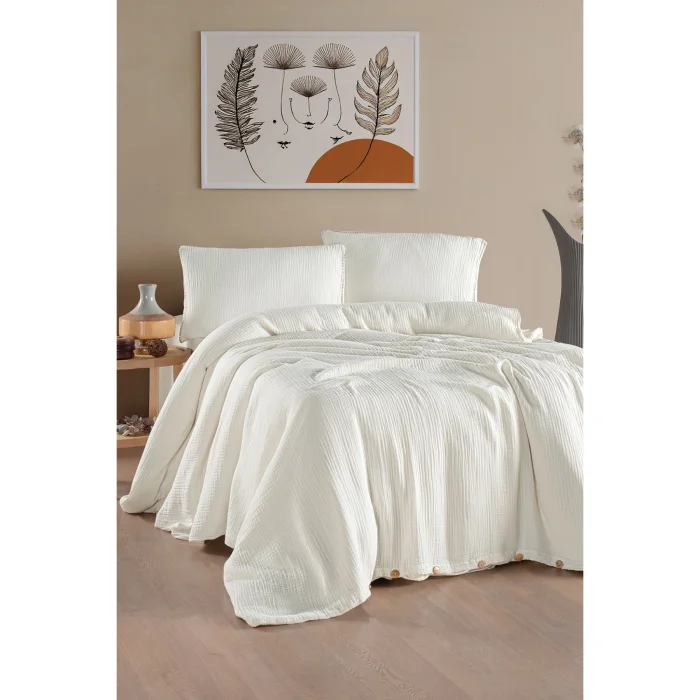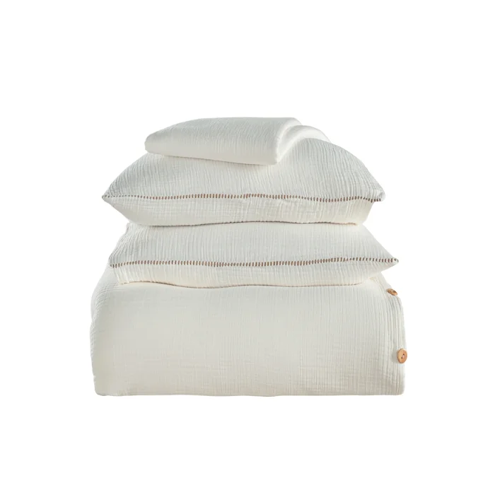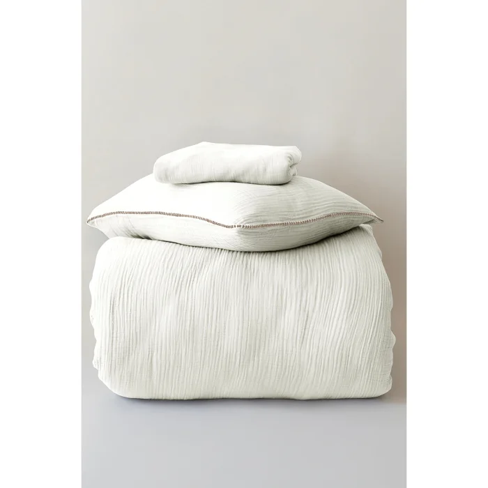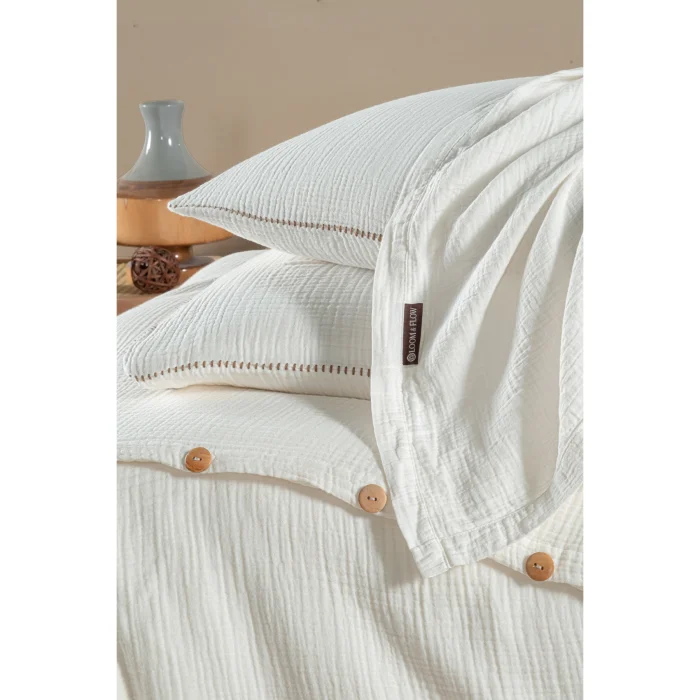 Duvet cover: Made of 100% cotton fabric that breathes; Sheet: 3-layer muslin fabric is used; Muslin fabric provides high air permeability, lightness and softness; Pillowcases: Made of muslin fabric with shepherd's stitch detail; Set contents and size details: Duvet cover: 200x220 cm; Sheet: 240x260 cm; Patterned pillowcase: 50x70 cm (2 pieces)