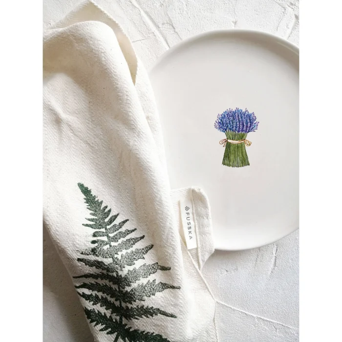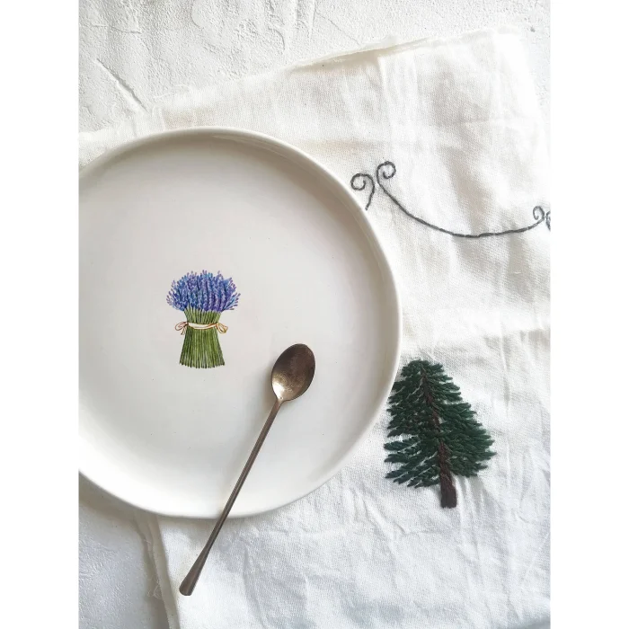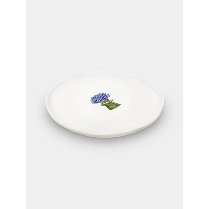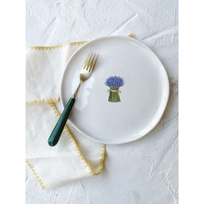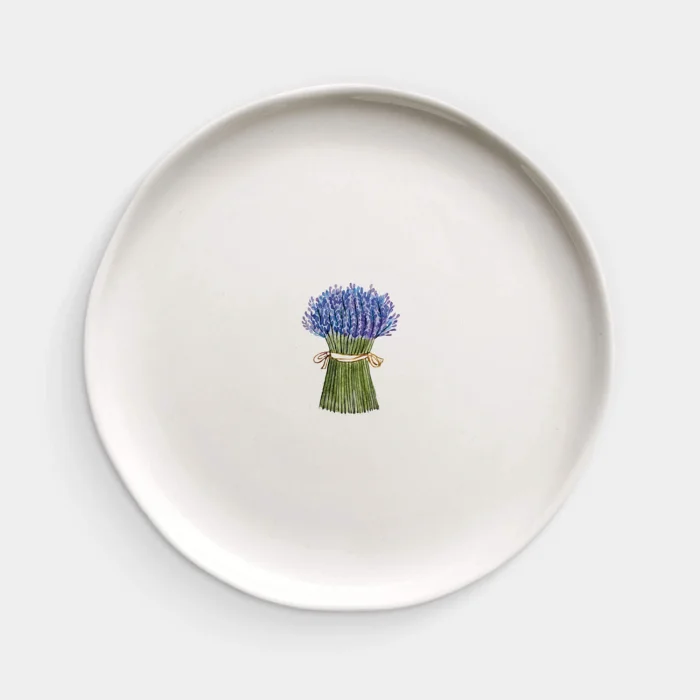 Lavender plate. We first start by shaping the clay to produce our fusska plates, which are all handmade. After waiting for it to dry, it enters the oven at 1000 degrees for the first firing. It is then painted with transparent glaze and re-enters the oven at 1040 degrees for the second firing. At the last stage, it is decorated and this time it enters the oven three times to see 840 degrees and is now ready to hit the road to meet your tables.