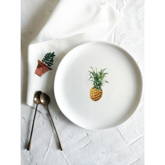 Fruit plate. We first start by shaping the clay to produce our fusska plates, which are all handmade. After waiting for it to dry, it enters the oven at 1000 degrees for the first firing. It is then painted with transparent glaze and re-enters the oven at 1040 degrees for the second firing. At the last stage, it is decorated and this time it enters the oven three times to see 840 degrees and is now ready to hit the road to meet your tables.