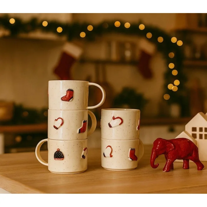 This mug is made entirely of handmade ceramic and hand-painted one by one with the theme of Christmas clothes. Thanks to its heat-resistant structure, it is suitable for hot and cold drinks. Since it is handcrafted, each product is unique and may have slight differences. It is an ideal design for both use and gift during the New Year period.