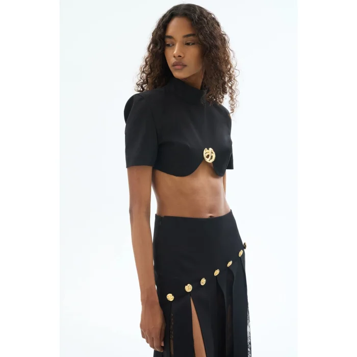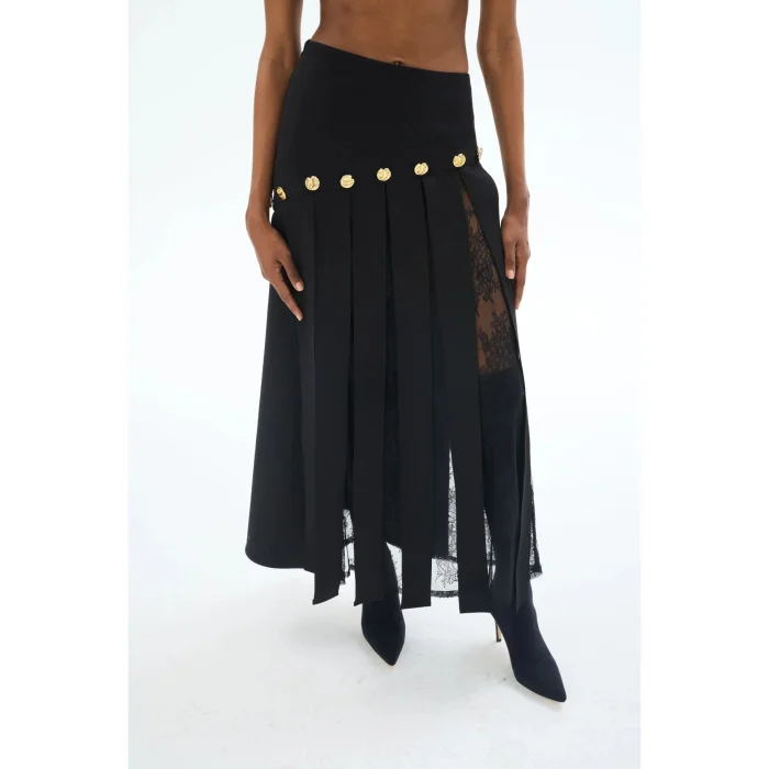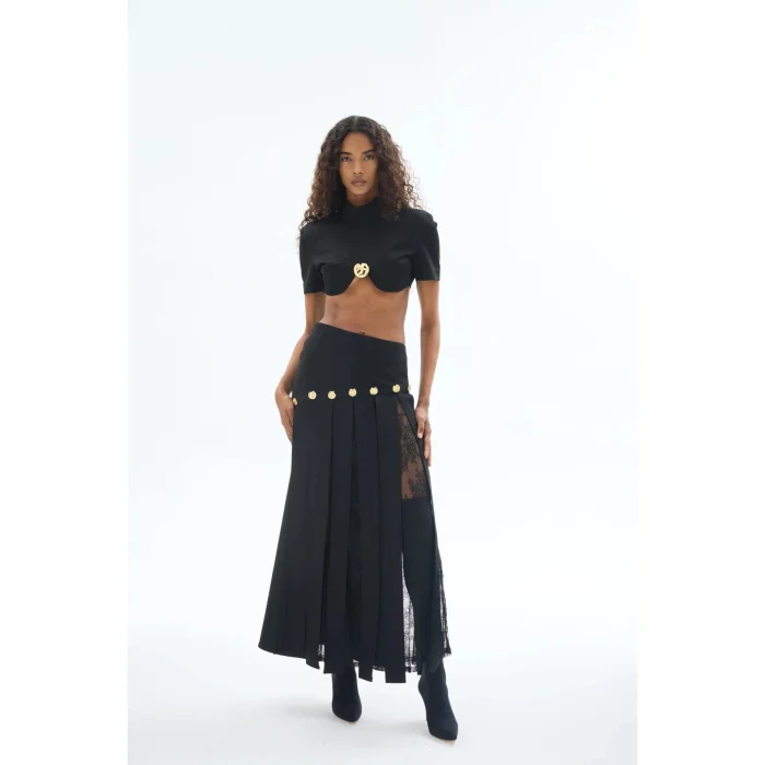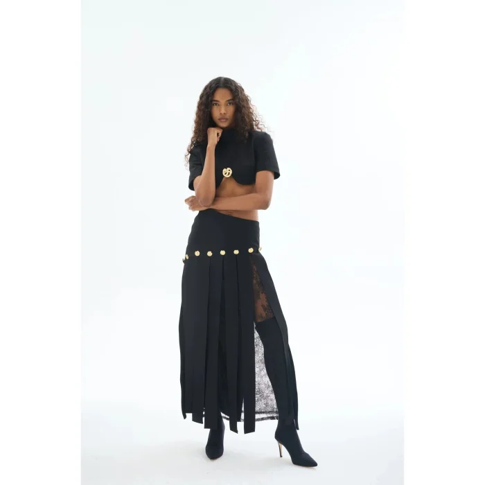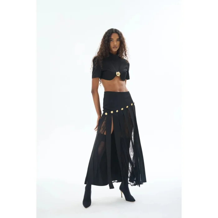 The black lace detailed skirt offers an elegant and stylish look, making it a remarkable choice for any special event. Carefully designed by the Gaia n Uranos brand, this skirt stands out with its quality fabric structure and aesthetic lace details.