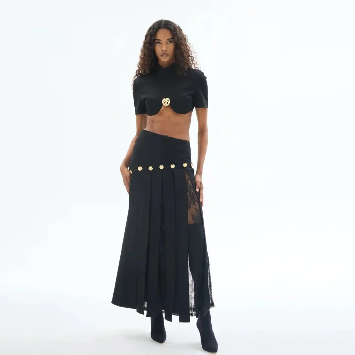 The pieced design of the skirt creates a modern silhouette, while the lace details add a feminine touch. This combination can be easily used for both daily and evening invitations. The high waist cut elegantly emphasizes the body lines, while its flexible structure provides freedom of movement.