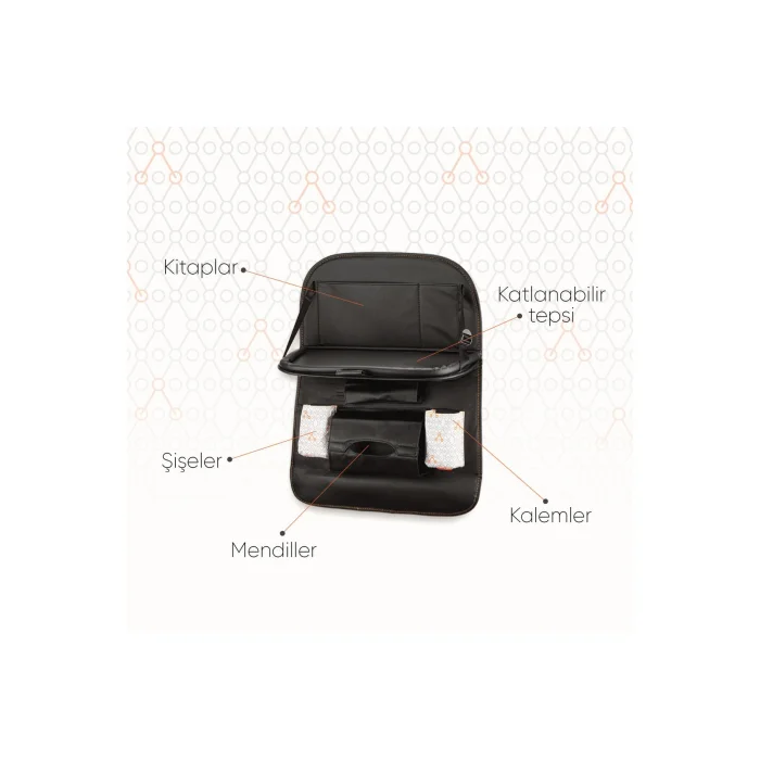 Product Description:Rear Seat Organizer for Kids: Add Order to Kids' Fun! Create a perfect layout in the back seat of your vehicle and easily organize all your children's entertainment materials. The Gezenbebe Rear Seat Organizer is made of durable and easy-to-clean material. The spacious pockets are ideal for your kids to store everything from coloring books and toys to drinks and snacks. Thanks to the adjustable straps, it is easily mounted and fits most vehicles. Salient Features:GEZENBEBE SIGNATURE:Gezenbebe Rear Seat Organizer, the perfect harmony of aesthetics and order! MULTI-PURPOSE USE: Foldable tray that can be used as an activity, dining or playground. DURABLE PU LEATHER: Easy-to-clean, high-quality PU leather material is resistant to the heavy use of our children. AMPLE STORAGE SPACE: Large and practical pockets for everything from books to drinks and small toys. EASY INSTALLATION: Thanks to the adjustable straps, it can be easily mounted without the need for any additional tools. Technical Details:Height: 58.5 cm (19 cm mesh pocket) Width: 43 cm Depth: 48 cmColor: BlackMaterials: Made of waterproof leather material. Put an end to in-car clutter and make journeys fun for your kids with the Rear Seat Organizer for Kids. Gezenbebe provides a place for everything our children need during the journey, providing fun and order together. Now journeys are more fun, more comfortable and more organized than ever!