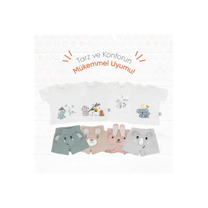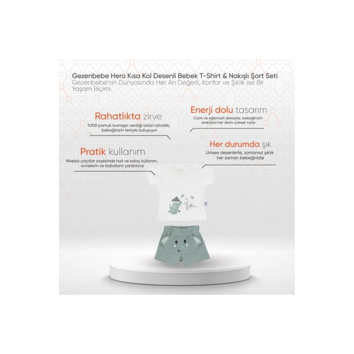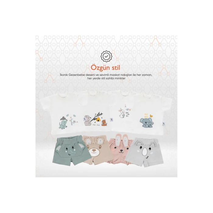 Product Description:Gezenbebe Hero Short Sleeve Patterned Baby T-Shirt & Embroidered Shorts Set: Style and Comfort in Perfect Harmony! With the highest level of comfort offered to your baby's delicate skin, make him feel the quality of Gezenbebe. The exquisite embroidery details of Gezenbebe's unique heroes, the Elephant, Koala, Teddy Bear and Rabbit, gently wrap around your baby's skin, making him both stylish and comfortable. Standout Features:GEZENBEBE'S UNIQUE DESIGN: This set offers more than just a Patterned Baby T-Shirt & Embroidered Shorts Set; It is a fashion statement of Gezenbebe with its special patterns and detailed embroidery. MEET THE SOFTNESS: With the unique softness offered by the 100% breathable cotton fabric, your baby's skin meets its most comfortable form. UNIQUE GEZENBEBE SIGNATURE: Thanks to our iconic pattern and cute mascots, your baby will feel comfortable and look stylish. PLAYFUL AND MODERN: With modern and fun design details, your baby's energy will never be lost. UNISEX ELEGANCE: With its fashionable patterns, your baby feels ready in every sense. EASY TO USE: Nickel-free snap buttons offer quick and convenient use. LIVE QUALITY: We value customer feedback and continuously improve our products for the best. Technical Details:Size Options: 0-3 months, 3-6 months, 6-9 monthsColor Options: Bunny, Elephant, Koala, Teddy (Organic). Review the size chart before completing the order. Make every moment of your baby's life precious with Gezenbebe. Its comfort and elegance are important to us. Feel that we are with your baby with this set that will make every day special!