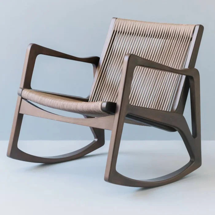 The wood is painted black. It is comfortable and lightweight with its design weave.