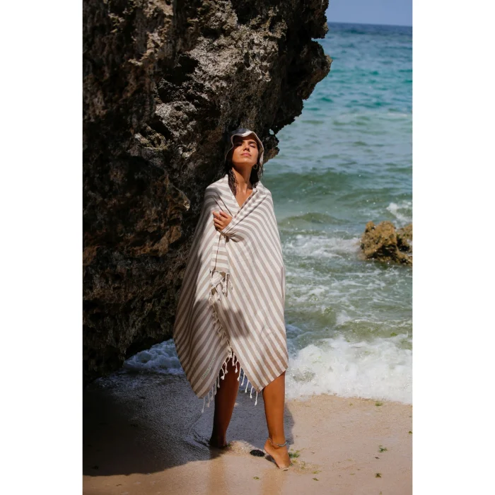 Environmentally friendly: 10 plastic bottles used for each peshtemal were turned into polyester threads. Sustainable: For each loincloth, 5 waste t-shirt fabrics were recycled into improved cotton yarns. Dye-free and Chemical-free: There was no use of dyes or chemicals at any stage of production. We obtained the dyed fabrics of the original materials of your peshtemal. Sea Friendly: We saved 5000 liters (1320.9 gal) of clean water for each loincloth. FEATURES Light and Portable: Don't worry about portability. Thanks to its 190 gram weight and light structure, it takes up minimum space in your beach bag or special carrying case. Ideal Size: Your 90x170 cm loincloth makes your beach experience more comfortable with its large size. Multi-Purpose Carrying Bag: You don't just buy a loincloth, you can use the practical bag of your loincloth for your beach accessory. Recycled and Reusable Package: You can reuse the special bags that are recycled and have dimensions of 34 x 14 cm. Wherever you can take your peshtemal while traveling in a special, sustainable bag, you can't easily keep it down.