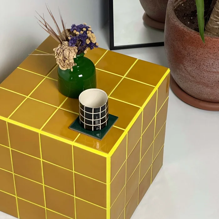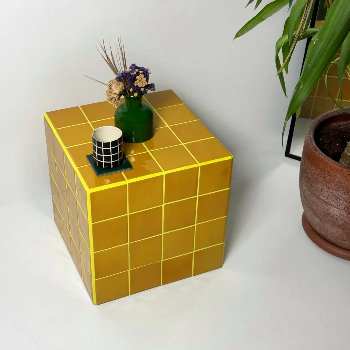 Size: 40X40X40h Weight: 27 kg Coating: Ceramic, glass mosaic or natural stone Internal skeleton: Wood Uses: Indoors only Delivery: 21 working days Made to order Since it is a handmade product, minor errors may appear