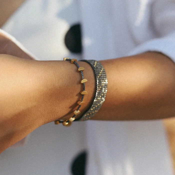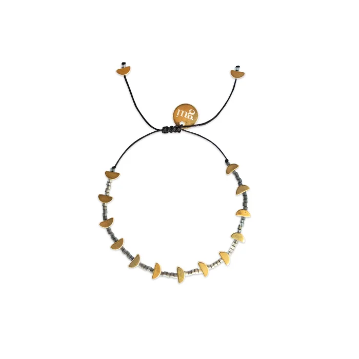 Night bracelet is produced with semi-circular shaped 18 carat gold plated brass beads. There are black colored glass beads between the brass beads. The bracelet can be adjusted for different wrist thicknesses with the help of the lift knot.