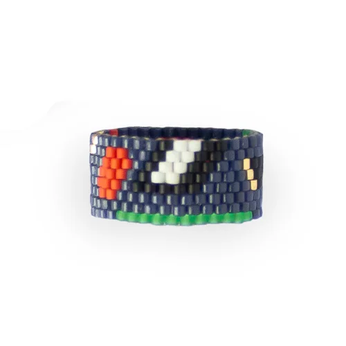 Rings are handsewn with glass beads. It is pretty robust and will not be damaged unless it is forced. It is not flexible and does not stretch much over time. There is no harm in contact with water.