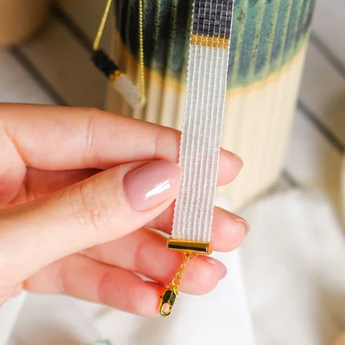 All bracelets are handsewn by using glass beads. The metal parts of the bracelet are made of brass plated with 18 karat gold. The bracelets adapt to different wrist thicknesses with the end chain.
