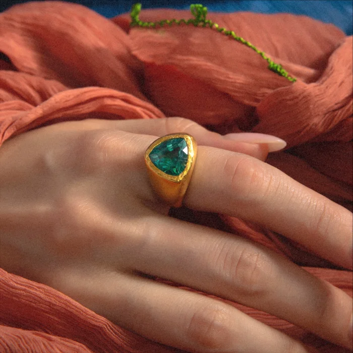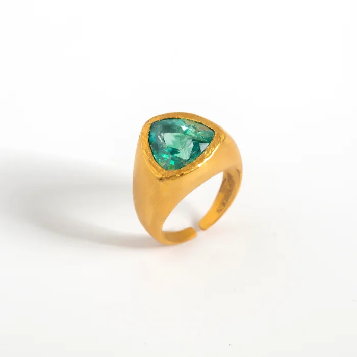 Completely handmade and set with a green cubic zirconia.