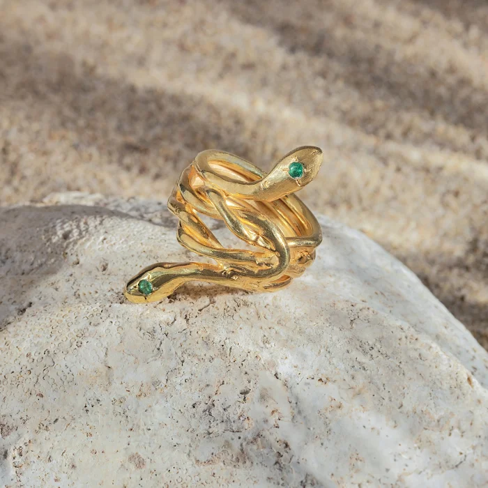Caduseus Ring is made with recycled 925 sterling silver 24ct gold plated. Completely handmade and set with two Emeralds on top of serpent heads. The product is size 7,5 and is produced in a single size.