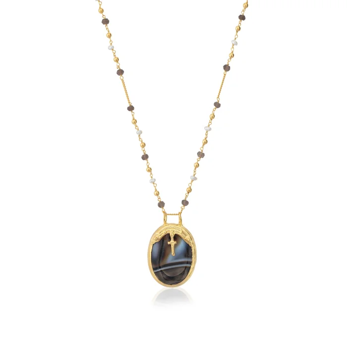 The Custodia necklace is completely handcrafted with 24-carat gold plating on 925 sterling silver. It is complemented by a banded agate stone, pearl and smokey quartz chain.