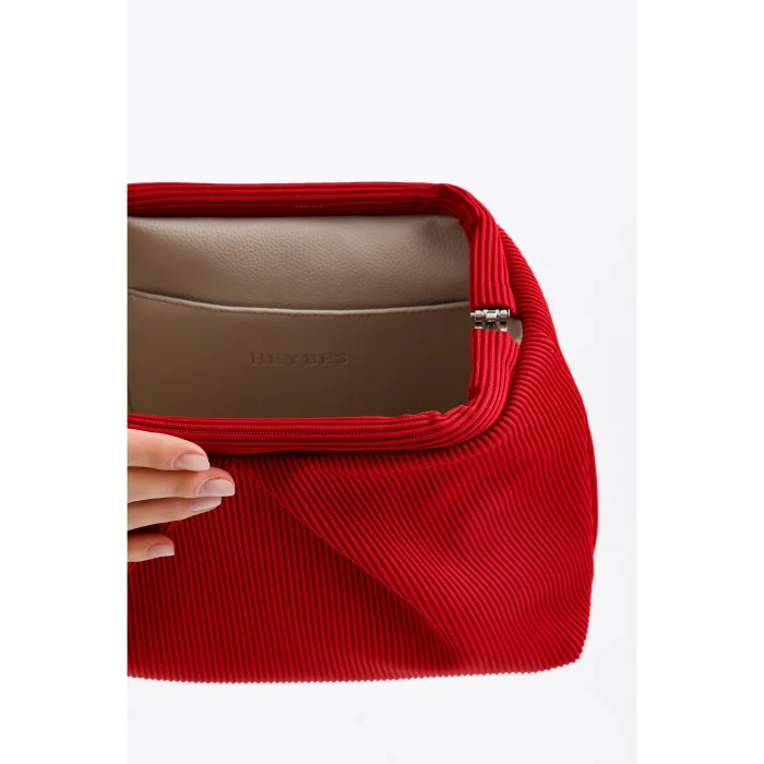 Made of pleated fabric, this clutch stands out with its elegant texture. The interior is covered with a faux leather lining and has a convenient inner pocket. Measuring 28 x 19 x 10 cm, its compact design makes it an ideal choice for both casual and evening chic.