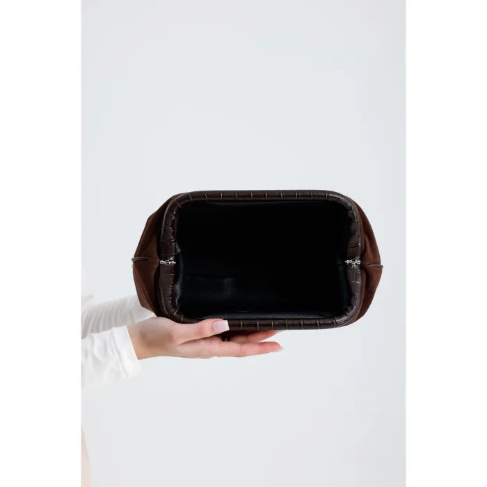 It is made of suede fabric. The interior is lined with artificial leather and has 1 inner pocket. It measures 28x19x10 cm (Width x Height x Depth). Suitable for both daily and night use.