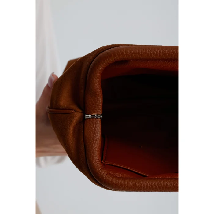 It is made of suede fabric. The interior is lined with artificial leather and has 1 inner pocket. It measures 28x19x10 cm (Width x Height x Depth). Suitable for both daily and night use.
